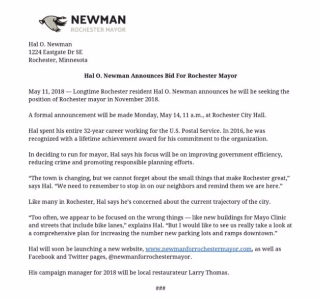 There wasn’t anything particularly remarkable about Hal Newman’s announcement that he intends to run for mayor of Rochester.